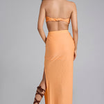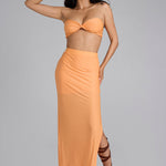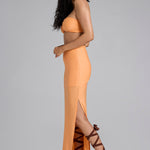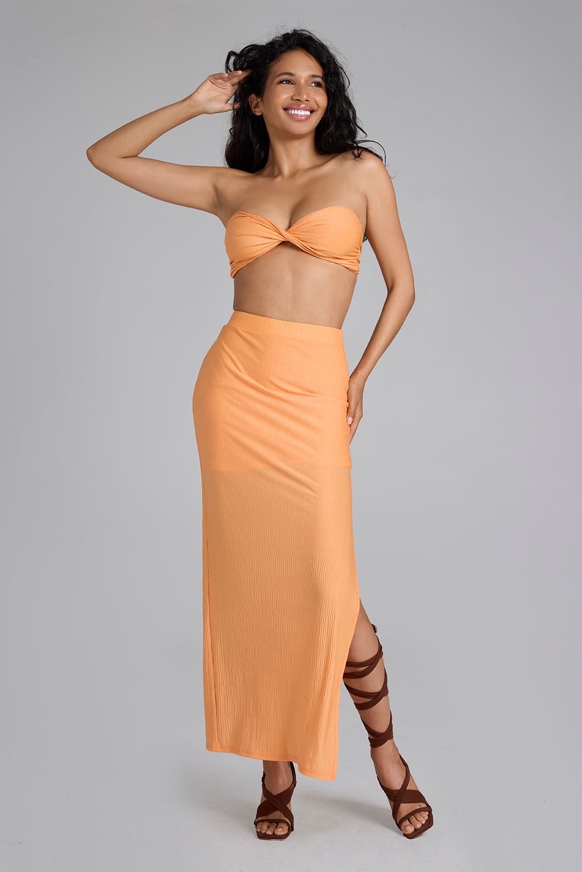 Introducing the Francesca skirt in its beautiful orange color. This stunning piece is a perfect blend of elegance and vibrance. With its flattering high waisted band and figure-hugging silhouette, it effortlessly accentuates your curves and adds a touch of glamour to any outfit.