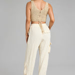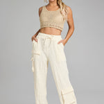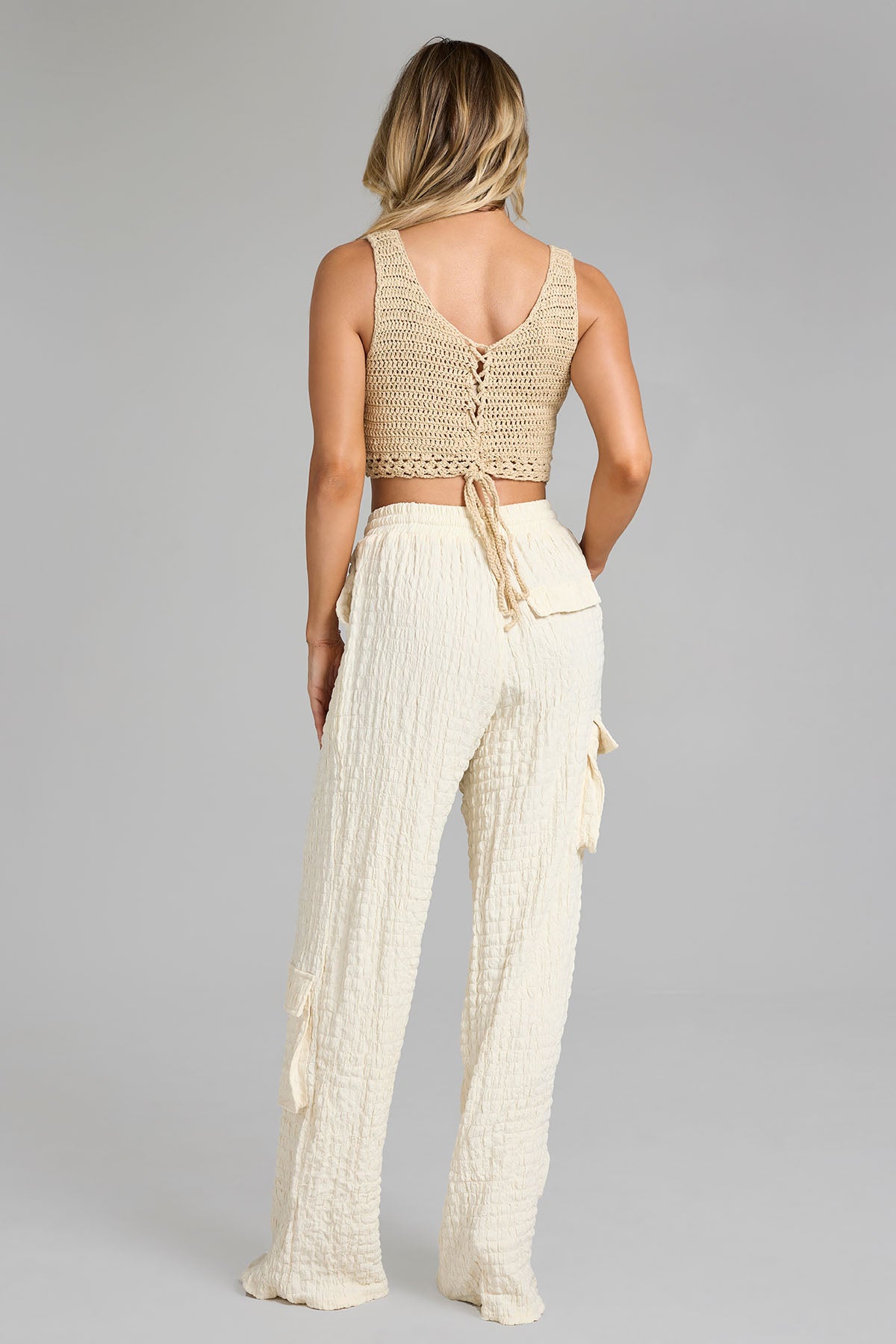 Introducing the White Lia Cargo Pants, a versatile and stylish addition to your wardrobe. Pairing perfectly with the Lia Crochet Top, this set will have you shining bright.